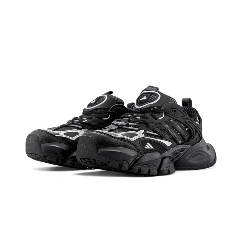 The adidas Vento XLG Deluxe Black blends modern design with performance-focused elements. The upper features a sleek black mesh base, complemented by synthetic overlays for added structure. The design is accentuated by reflective silver accents along the midfoot and heel, giving the sneaker a futuristic, high-tech look. A bold, sculpted midsole adds dimension and cushioning, while the wavy rubber outsole ensures both durability and traction. The sneaker’s dynamic lines and layered construction contribute to a contemporary aesthetic, making it a stylish yet practical choice for everyday wear or fashion-forward looks.