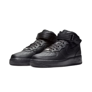 The Nike Air Force 1 Mid ’07 Black brings the familiar AF1 heritage into a clean, all-black mid-cut build, combining sturdy leather panels with a smooth matte finish that gives the shoe its signature structured look. The upper blends crisp overlays with a padded mid-ankle strap that locks in securely while adding that classic hoops-inspired silhouette. Perforations at the toe keep airflow steady, and the Swoosh sits boldly along the sidewalls, embossed just enough to catch light without breaking the stealth aesthetic. Inside, soft cushioning lines the collar and tongue, while the foam midsole carries the renowned Air unit for everyday comfort and stability. The outsole uses the classic circular traction pattern for dependable grip, giving the entire design a durable, uniform feel that stays true to the AF1 legacy while delivering an understated, all-black finish perfect for any setting.