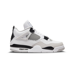 The original 1989 "Military Blue" version of the Air Jordan 4 features the same colour blocking and construction as the latest Air Jordan 4 Retro "Military Black." The top is made of smooth white leather and is supported by a forefoot overlay made of grey suede.
