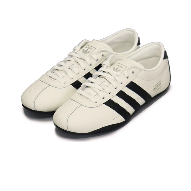 The adidas Tokyo Off White Core Black Gold Metallic (Women’s) delivers a refined mix of understated tones and luxe accents on its timeless low-profile build. The upper is crafted in smooth off-white leather, contrasted by bold black adidas stripes and heel tab that highlight the shoe’s sharp lines. Touches of gold metallic detailing bring an elevated finish, adding a sense of sophistication without taking away from the clean, versatile look. The lightly padded collar and soft lining ensure comfort, while a cushioned midsole provides reliable support for daily wear. Underfoot, the classic rubber outsole offers grip and durability, rounding out a design that fuses casual heritage style with premium flair.