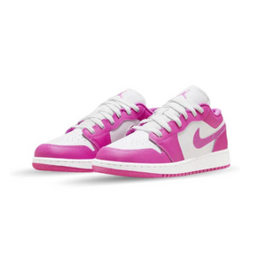 The Jordan 1 Low Fire Pink (GS), in grade school sizes, is an athletic sneaker with a low top silhouette. The leather upper is done in White at the vamp and quarter, accented by Fire Pink overlays on the tip, heel, lace panel, and midsole. The Nike Swoosh in pebbled Iris Whisper offsets the Fire Pink prominence, while the Jumpman logo on the tongue and wings logo on the rear heel complete the aesthetic.