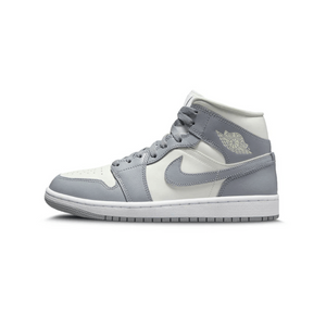 This Mid Air Jordan 1 for women is made of leather. Contrast is created between the sail foundation and the panels of stealthy grey which wrap all around heel, toe box, and ankle. The winged basketball image is debossed on this sneaker's collar. This shoe also has a Nike's Swoosh logo that boasts on medial and on the lateral sides. A solid grey rubber outsole and a white Air-cushioned midsole complete the design
