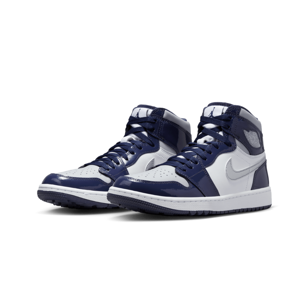 The Air Jordan 1 Retro High Golf Patent Midnight Navy features a smooth leather texture, eye stays, mudguard, heel, and collar in this colorway.