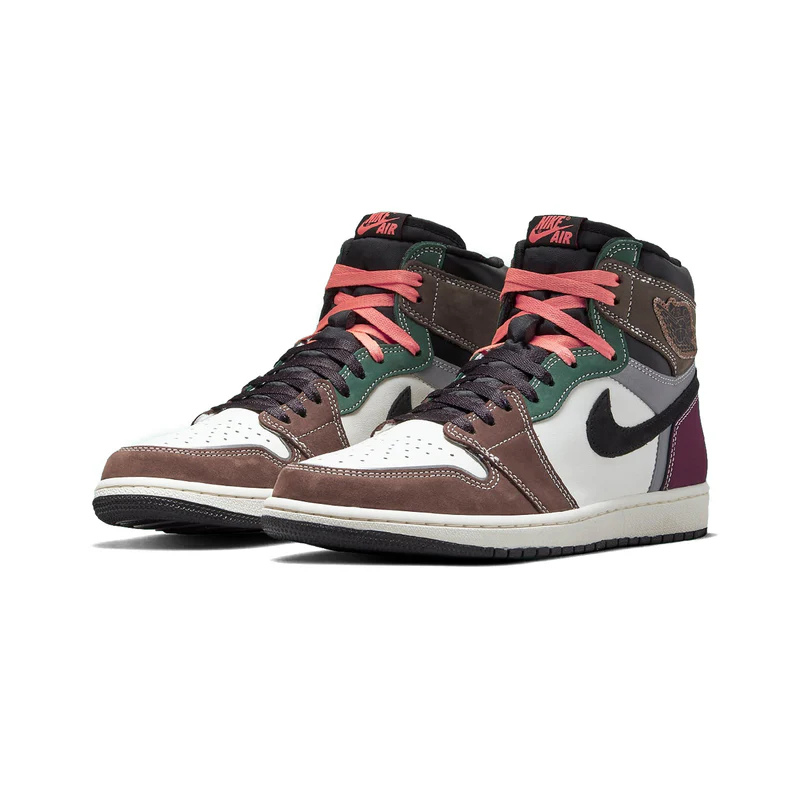 The Air Jordan 1 Hand Crafted features a white leather upper with multicolor leather and Durabuck overlays for a unique look. From there, Wings logo collar patches and two-tone laces add a DIY feel