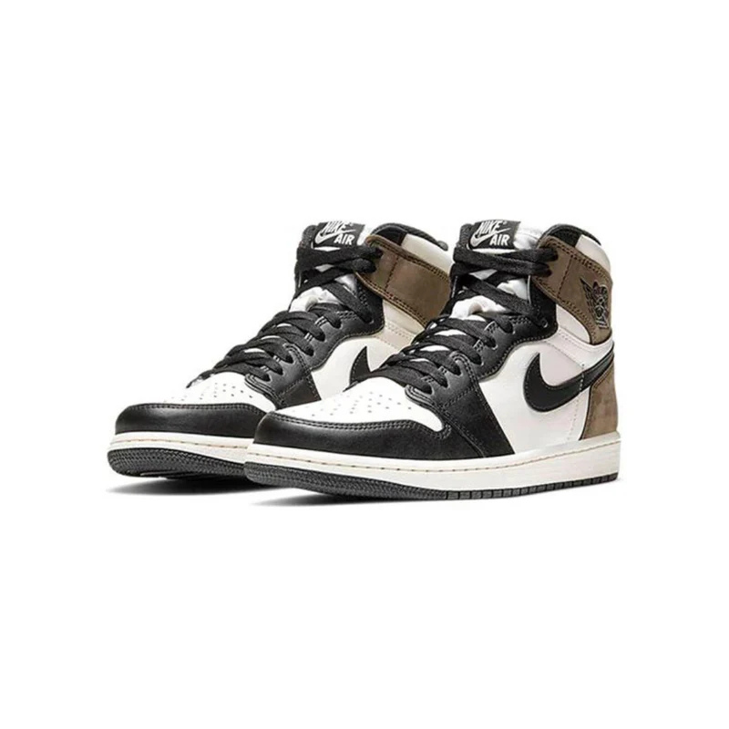 The upper of the Jordan 1 High Dark Mocha features a Sail leather base with black leather surrounding the toe box and Mocha suede on the heel and ankle. A black leather Swoosh, Jordan Wings logo on the ankle, and Nike Air branding on the tongue pays homage to branding that can be found on the original 1985 Jordan 1. A Sail midsole and black outsole complete this Black Toe design