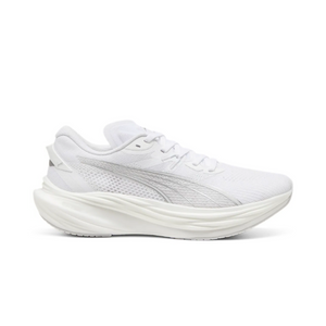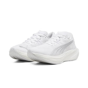 Puma Deviate Nitro 3 White Feather Grey showcases a performance-driven design built for long-distance comfort and speed. The upper is crafted from lightweight engineered mesh in a clean white tone with subtle feather grey accents, ensuring breathability and a supportive fit. Puma’s Nitro midsole technology offers responsive cushioning with a propulsive feel, while an integrated carbon composite plate enhances energy return for efficient strides. The outsole features durable PUMAGRIP rubber with a traction pattern designed for both road grip and smooth transitions. Sleek branding elements and aerodynamic shaping complete the look, making it ideal for runners seeking speed and stability in a refined aesthetic.