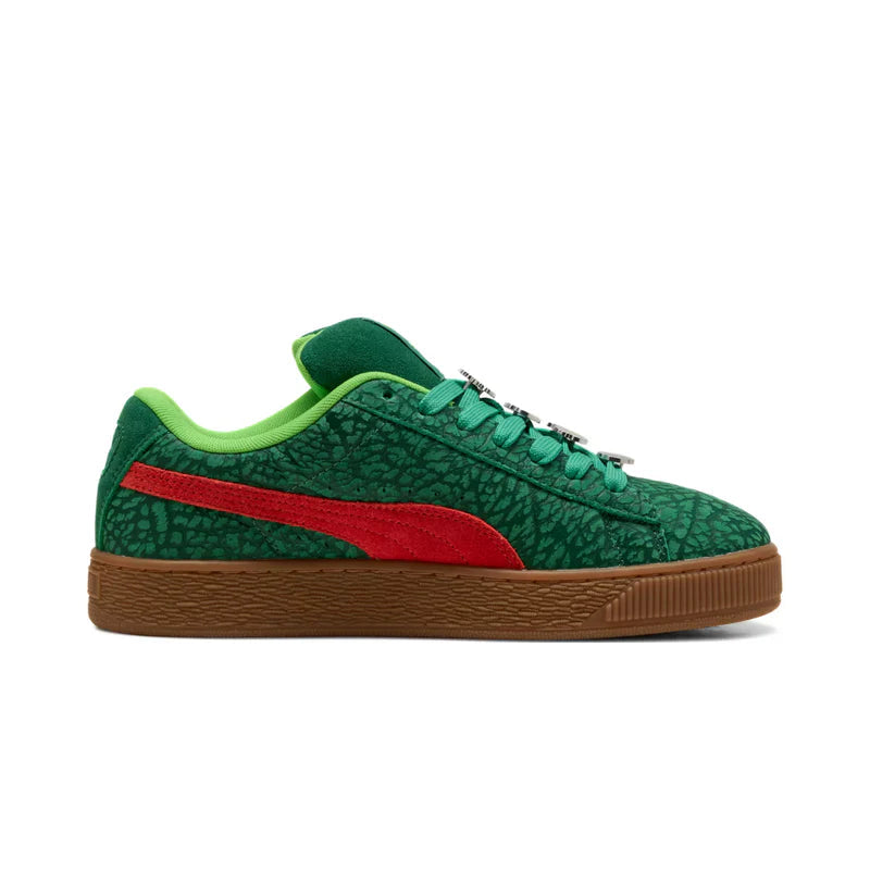 The Puma Suede XL Teenage Mutant Ninja Turtles reimagines the classic Suede XL silhouette with inspiration from the iconic heroes in a half shell. Its upper is crafted from premium suede in tones that nod to the TMNT aesthetic, paired with playful detailing and subtle graphic elements referencing the legendary cartoon. The exaggerated proportions of the Suede XL give it a modern, chunky profile while retaining the timeless Puma Formstrip branding along the sides. A cushioned insole and padded collar ensure everyday comfort, while the durable rubber outsole provides reliable grip. This collaboration fuses nostalgic pop culture with Puma’s heritage style, creating a bold and collectible statement piece.