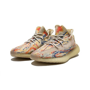The adidas Yeezy Boost 350 V2 MX Oat stands out with its lively and artistic appearance, blending the signature comfort of the Yeezy line with a strikingly colorful design. The Primeknit upper features a unique marbled mix of cream, orange, blue, and yellow tones, creating a swirling, abstract effect that sets it apart from the typically neutral Yeezy palette. A translucent side stripe runs along the lateral side, offering a modern touch while maintaining breathability and structure. The shoe’s full-length Boost midsole is encased within a semi-translucent rubber shell that provides responsive cushioning and all-day comfort. A pull tab on the heel ensures easy wear, while the ribbed outsole enhances traction and durability. This fusion of vibrant artistry and advanced comfort makes the MX Oat one of the most visually dynamic releases in the Yeezy 350 V2 lineup.