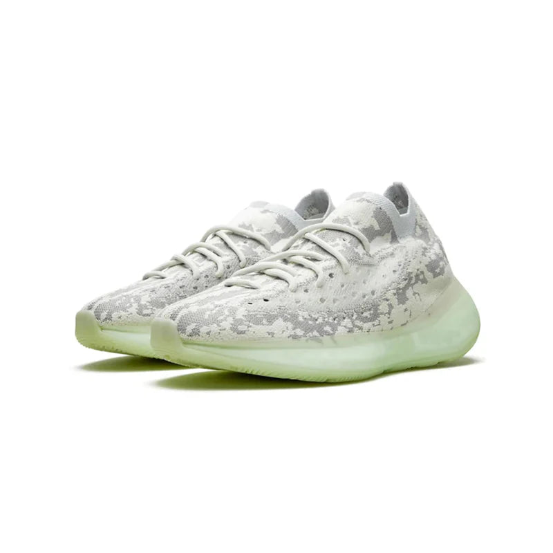 The Boost 380s embrace the grey hue to create an ombre on the upper prime knit, merging into the glow-in-the-dark sole.