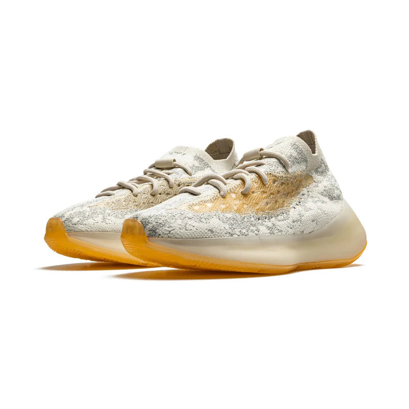 adidas Yeezy Boost 380 Yecoraite Reflective: Featuring a fully knitted Primeknit upper in soft Yecoraite hues interwoven with reflective yarns that shimmer under changing light, this iteration wraps the foot in a snug, sock-like embrace. A translucent monofilament cage subtly supports the midfoot without interrupting the shoe’s sleek lines, while a molded TPU heel tab adds structure and ease of entry. Underfoot, a full-length BOOST midsole housed in a semi-translucent rubber shell delivers plush, responsive cushioning with a distinctive ripple effect visible through the sidewalls. The grippy herringbone-patterned outsole ensures dependable traction across surfaces, and minimalist adidas and YEEZY branding on the heel and insole keeps the focus on the shoe’s ethereal, light-reflective aesthetic—melding futuristic style with next-level comfort.