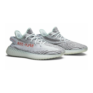 The Adidas Yeezy Boost 350 V2 Blue Tint has a marbled grey Primeknit upper with a light grey side stripe that is embellished with brilliant red SPLY-350 writing, akin to the well-known Adidas Yeezy Boost 350 V2 Zebra. A Blue Tint semi-translucent Boost sole at the bottom gives support and cushioning.