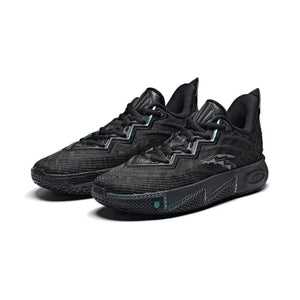 The Anta Kai 2 “Triple Black” brings a stealth-focused look to the silhouette, using layered textiles and molded synthetics that blend together in a deep, uniform black tone while still showing off the shoe’s sharp sculpting and textures. The forefoot is wrapped in tightly woven mesh with a subtle matte finish, balanced by smooth midfoot panels and ridged overlays that add structure without breaking the monochrome theme. Around the collar and heel, embossed Kyrie-inspired detailing hides within the shadows, giving the shoe a low-key but expressive identity. The midsole follows the same blackout treatment, with its wavy, carved lines creating depth as they transition into the performance-focused cushioning platform beneath. Underfoot, the grippy, multi-directional outsole extends slightly up the sides for stability during quick cuts, and the padded interior keeps the fit soft and secure. The result is a sleek, unified design where every material, curve, and texture works together to create a bold all-black statement.