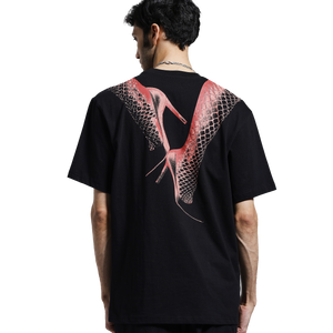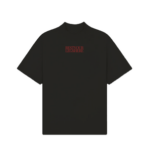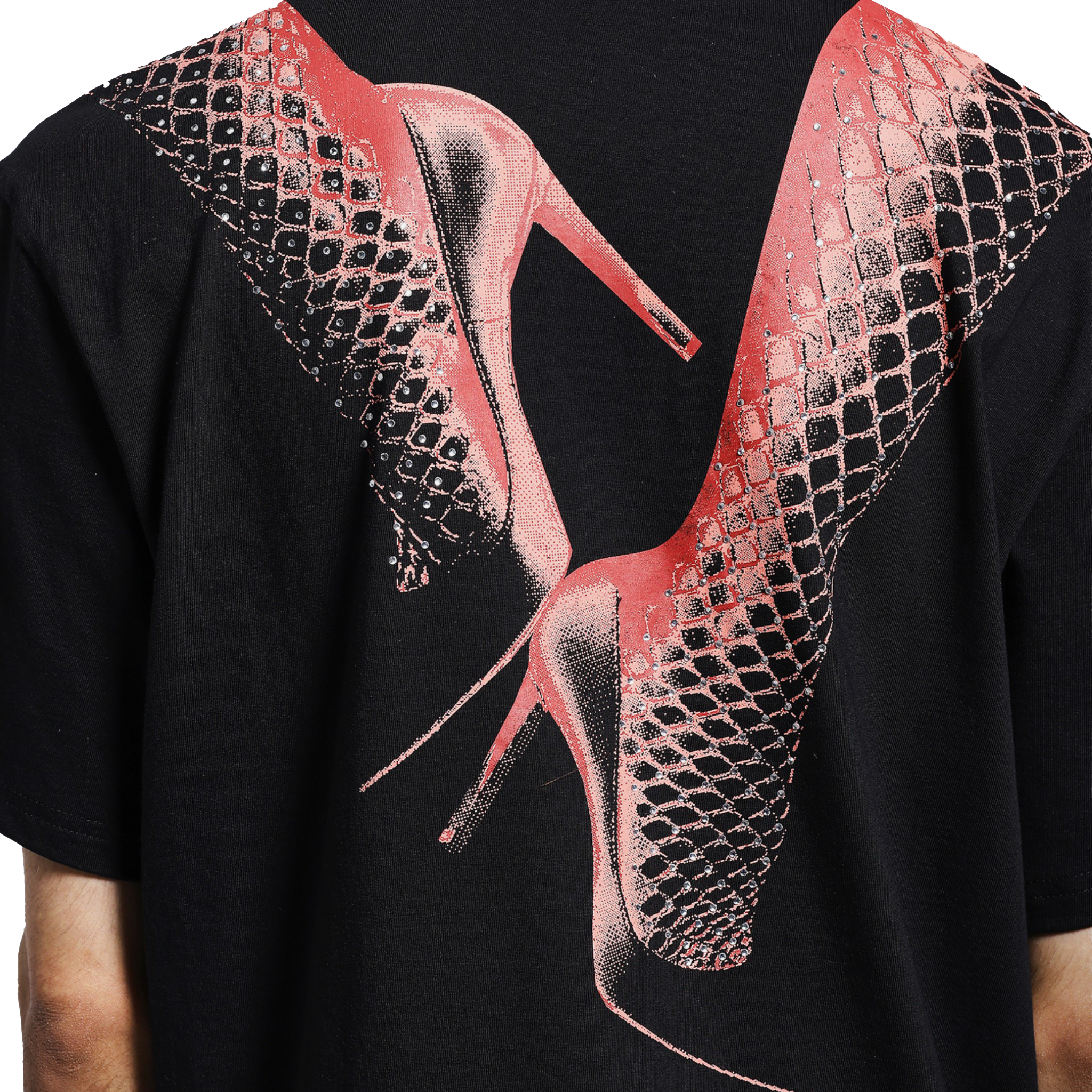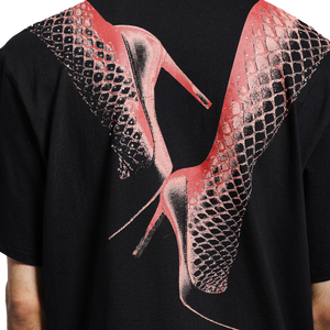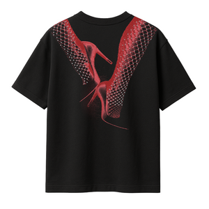 Designed for those who embrace bold statements and sleek aesthetics, this premium black T-shirt features striking red typography on the front and an eye-catching high heels wrapped in fishnet stockings on the back , effortlessly draped across the shoulders for a sensual yet edgy appeal.