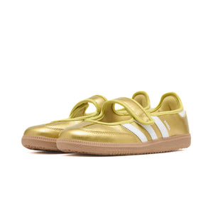 The adidas Samba JANE Gold Metallic Cloud White Gum (Women’s) reimagines the iconic Samba through a modern Mary Jane lens, blending heritage sport DNA with a fashion-forward silhouette. The upper is crafted from smooth gold metallic leather that delivers a polished, statement finish, while Cloud White Three Stripes, heel detailing, and tongue branding create sharp contrast and visual balance. An adjustable strap across the midfoot adds both secure fit and a distinctive design element, setting it apart from the traditional lace-up Samba while maintaining its low-profile proportions. Inside, a soft lining enhances comfort for all-day wear, and beneath the foot, the classic gum rubber outsole grounds the look with vintage character, reliable traction, and timeless appeal.