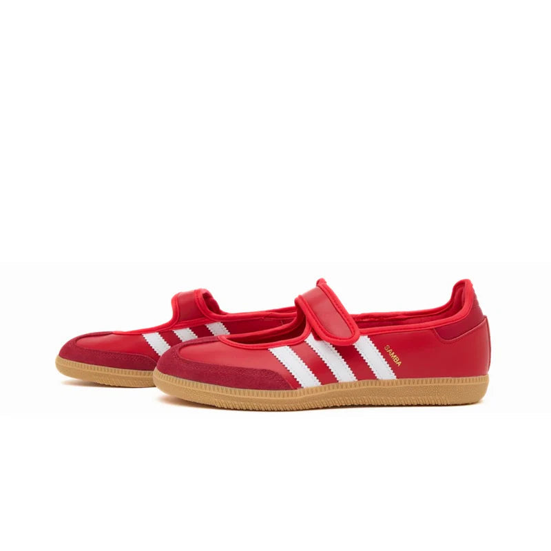 The adidas Samba Jane Scarlet White Gum (W) reimagines the classic Samba silhouette through a modern lens, blending nostalgic sportswear cues with playful, fashion-forward details. The upper is constructed from smooth leather in a vivid scarlet red, contrasted by sharp white 3-Stripes and a matching heel tab. A single Velcro strap replaces traditional laces, giving the sneaker a Mary Jane-inspired look that's both minimal and bold. The T-toe overlay is done in tonal suede, enhancing the texture contrast while staying true to the Samba DNA. Underfoot, the translucent gum sole adds warmth and retro appeal, making the shoe a perfect mix of heritage style and fresh expression.