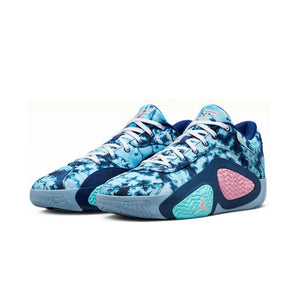 The Jordan Tatum 2 GPX "Denim" is a distinctive sneaker that merges bold aesthetics with performance-driven features, reflecting Jayson Tatum's dynamic style on and off the court. This model showcases a unique tie-dye denim upper in shades of Blue Void, Leche Blue, Tropical Twist, and Bleached Coral, complemented by vibrant foam pods that evoke the playful spirit of '90s basketball shoes. Designed for optimal performance, it features a full-length Nike Air Strobel unit for responsive cushioning, lightweight foam and textile pods strategically placed for support, and a modified herringbone traction pattern on the outsole to ensure superior grip during dynamic movements. The shoe's construction emphasizes both comfort and stability, catering to players seeking agility without compromising on support. Additionally, the Tatum 2 GPX "Denim" incorporates sustainable materials, aligning with eco-conscious design principles. Personal touches, such as Tatum's logo and meaningful phrases like "Find a Way" and "Like Father, Like Son," are featured on the heel, adding a unique narrative element to the sneaker. This model not only delivers on-court performance but also stands out as a fashion-forward choice for sneaker enthusiasts