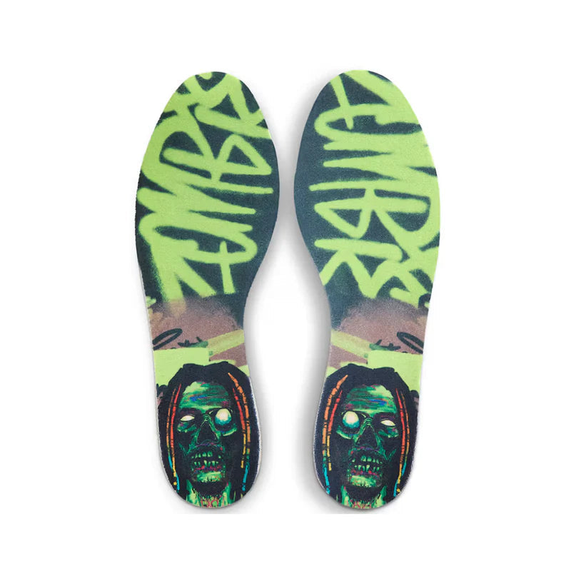 The Nike Ja 3 “Zombie” channels Ja Morant’s fearless energy and relentless drive, blending eerie aesthetics with next-level performance technology. The upper features a bold mix of green and black tones inspired by zombie lore, constructed from lightweight mesh and fused synthetic overlays for optimal breathability and support. Distressed textures and jagged graphic details mimic the gritty, unpredictable energy of the undead theme, while crimson accents on the Swoosh, tongue, and stitching add a menacing contrast. The sculpted midsole houses responsive Zoom Air cushioning in the forefoot, delivering explosive lift-offs and soft landings ideal for Morant’s high-flying style of play. A reinforced heel counter and padded collar ensure stability and comfort, while the grippy rubber outsole with a unique traction pattern provides multidirectional control on quick cuts and sprints. With its fusion of dark storytelling and performance precision, the Nike Ja 3 “Zombie” captures the raw, fearless edge that defines Ja’s game—bringing an unmistakably intense presence to the court.