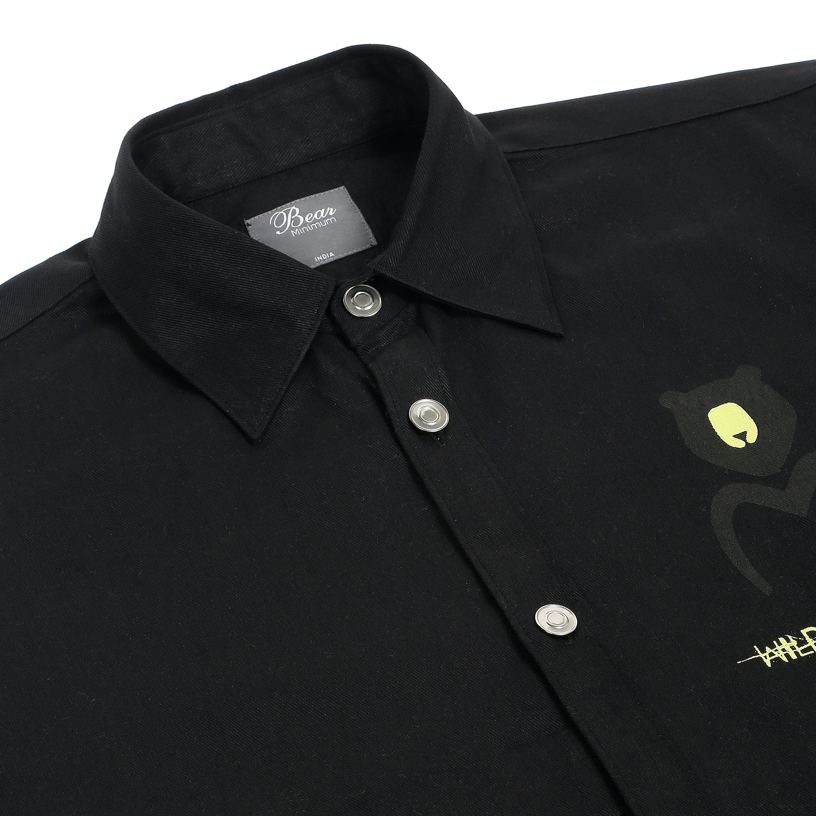 A versatile full-sleeve piece in black heavy denim that doubles as a shirt or shacket, complete with metal heavy buttons for a rugged edge.
