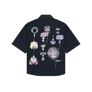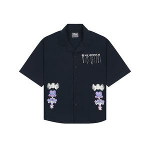 Crafted from navy blue 100% polyester Barbie fabric for supreme softness and elegant flow, this half-sleeve shirt balances subtlety and intensity.