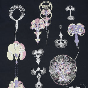 The front offers a understated print, while the back explodes with heavy artwork inspired by hallucinations—featuring sperm-like figures, brain motifs, cryptic notes on human existence, and dangling threads emerging from the designs, evoking a dreamlike exploration of the subconscious mind.