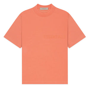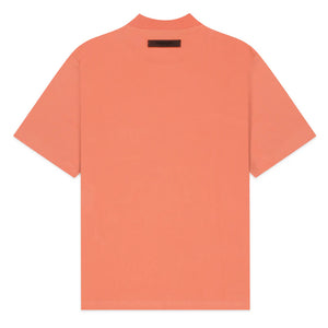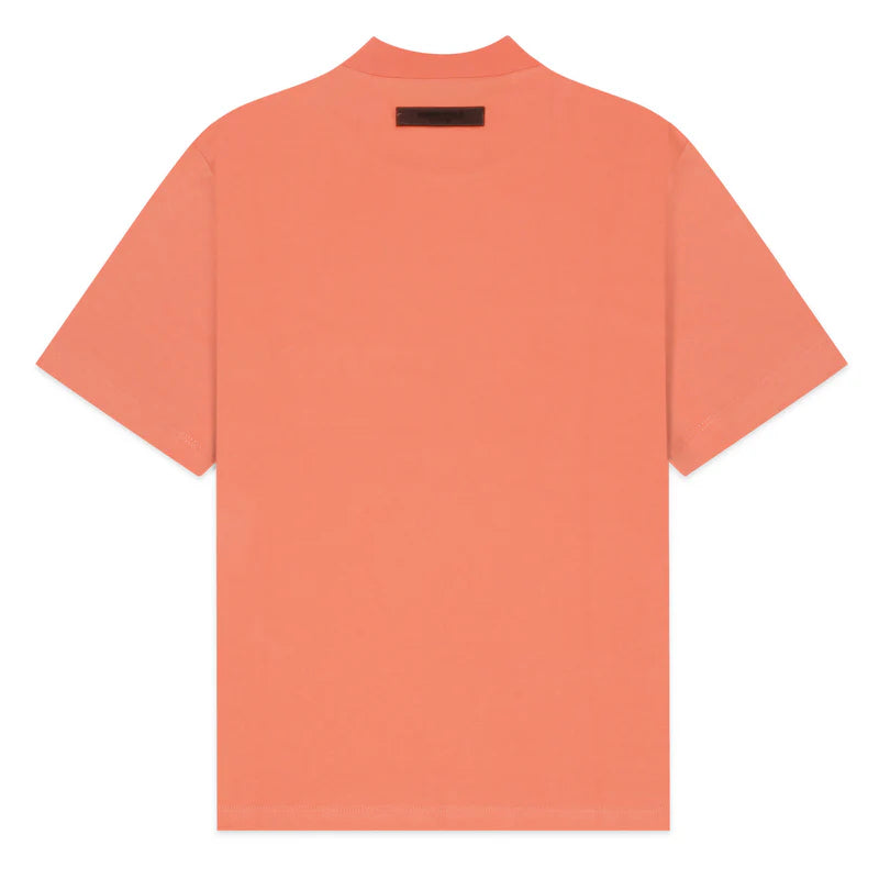 The t-shirt is made from cotton and has a full coral color that extends to its short sleeves. It also features Essentials branding in toned velvet on the left side where the breast pocket is traditionally located and an Essentials rubberized label at the back collar. It is part of The Fear of God Essentials Fear of God line and can be found in many more colors.