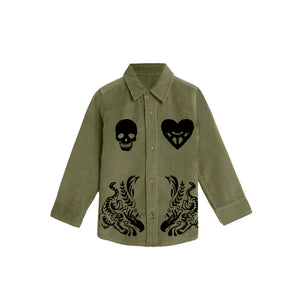 Crafted from super-premium corduroy fabric in a rich military green, this piece offers a luxe, tactile feel with a design that’s both bold and elegant. Skulls and Petals is for those who appreciate the complexity of existence and want to express it through their style—combining timeless symbols with the finest craftsmanship for a standout look that’s both sophisticated and fierce.