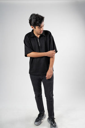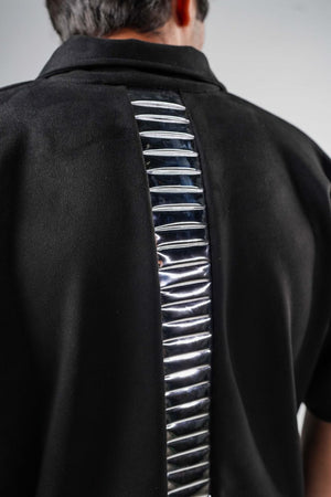Crafted from soft vegan suede, Kreflct’s Suede Spinal Polo stands out with silver leather pleats that run straight down the back - a unique feature that adds structure. It features a clean zip-up front and a sharp collar, and the relaxed fit makes it comfortable while still looking polished. Best worn with tailored cargos or structured bottoms when you want a look that's intentional.