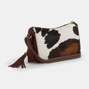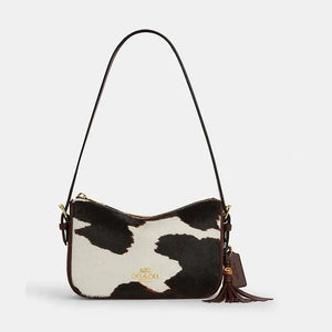 The Coach Kailey Shoulder Bag features distinctive cow print haircalf in a multi-tone palette, complemented by a stylish tassel detail. Crafted for both visual impact and everyday use, this bag offers a structured silhouette and convenient shoulder strap for comfortable wear. Its bold pattern and expert craftsmanship make it a standout accessory for elevating any outfit with a touch of modern Western flair.