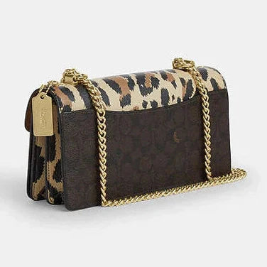 The Coach Klare Envelope Crossbody Bag expertly blends signature canvas with striking leopard print pebbled leather for a bold, fashionable statement. Its compact envelope design offers a sleek silhouette while providing convenient crossbody functionality for hands-free carrying. This bag balances distinctive style with practical usability, making it a versatile accessory for both casual outings and refined occasions.