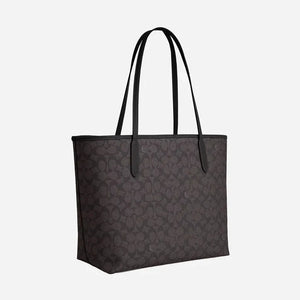 Elevate your everyday style with the Coach Large City Tote Bag in Maxi Signature Canvas. Crafted from durable signature canvas in a rich blend of gold, walnut, and black, this spacious tote offers both elegance and practicality. Perfect for carrying your essentials and more, it features sturdy handles and a sleek design that seamlessly complements any outfit, making it an essential accessory for city life.