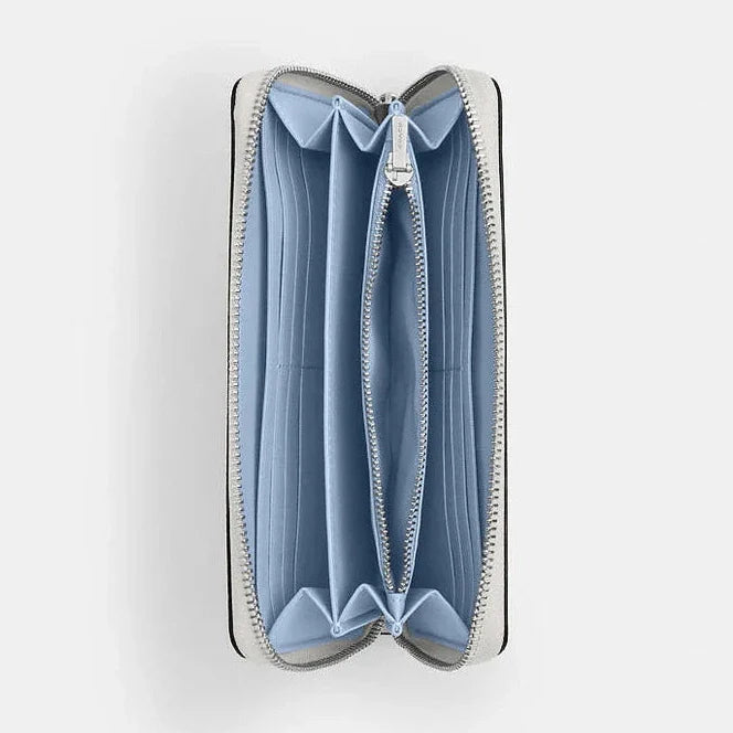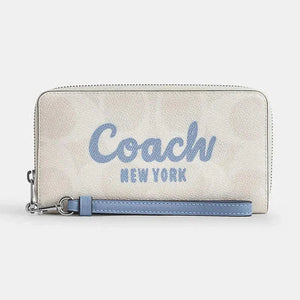 The Coach Long Zip Around Wallet in Signature Canvas features a distinctive graphic print in a stylish chalk and bluebell color palette. Crafted with durable signature canvas, this wallet offers organized storage with multiple card slots, a zippered coin compartment, and ample room for bills. Its secure zip-around closure ensures your essentials stay protected, combining functionality with iconic Coach design for everyday use.