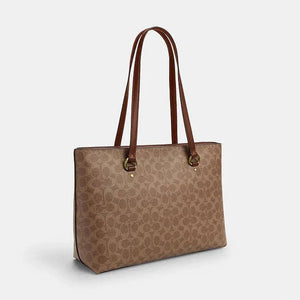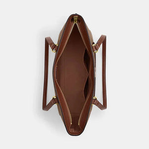 The Coach Station Tote Bag in Signature Canvas Gold-Tan-Brown showcases Coach’s iconic pattern combined with durable canvas for a timeless yet practical design. This tote offers a roomy interior perfect for organizing essentials, with sturdy handles designed for comfortable daily use. Its classic color combination suits both professional and casual settings, making it a versatile and enduring accessory.