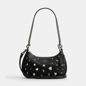 The Coach Teri Mini Crossbody Bag in pebbled leather combines edgy rivet detailing with modern sophistication. Featuring a striking gunmetal finish and a black multi palette, this compact crossbody delivers both style and functionality. Expertly crafted for versatility, it offers just the right amount of space for essentials while adding a bold, contemporary touch to any outfit. Perfect for those seeking a refined accessory with a distinctive edge.