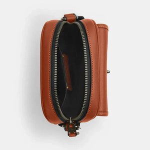 Crafted from smooth leather, the Coach Turnlock Crossbody Bag blends refined style with practical design. Its gunmetal hardware complements the rich tan leather, adding a contemporary touch. Compact yet spacious enough for essentials, this bag features a secure turnlock closure and an adjustable strap for comfortable wear. Ideal for those seeking a versatile accessory that combines durability with timeless elegance.