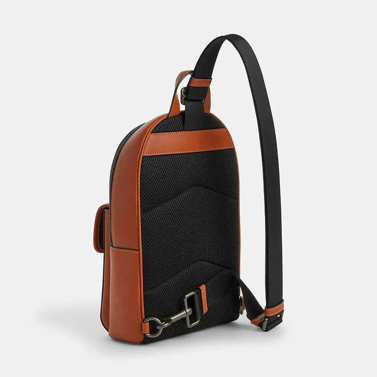 The Coach Turnlock Sling Pack in smooth leather combines sleek design with functional elegance. Featuring a refined gunmetal finish paired with warm tan leather, this sling pack offers secure storage with its signature turnlock closure. Its compact silhouette provides hands-free convenience while maintaining a polished look, ideal for urban professionals seeking both style and practicality in everyday wear. Expertly crafted, it elevates your accessory game with understated luxury.