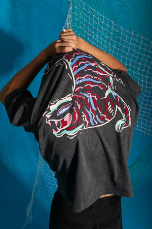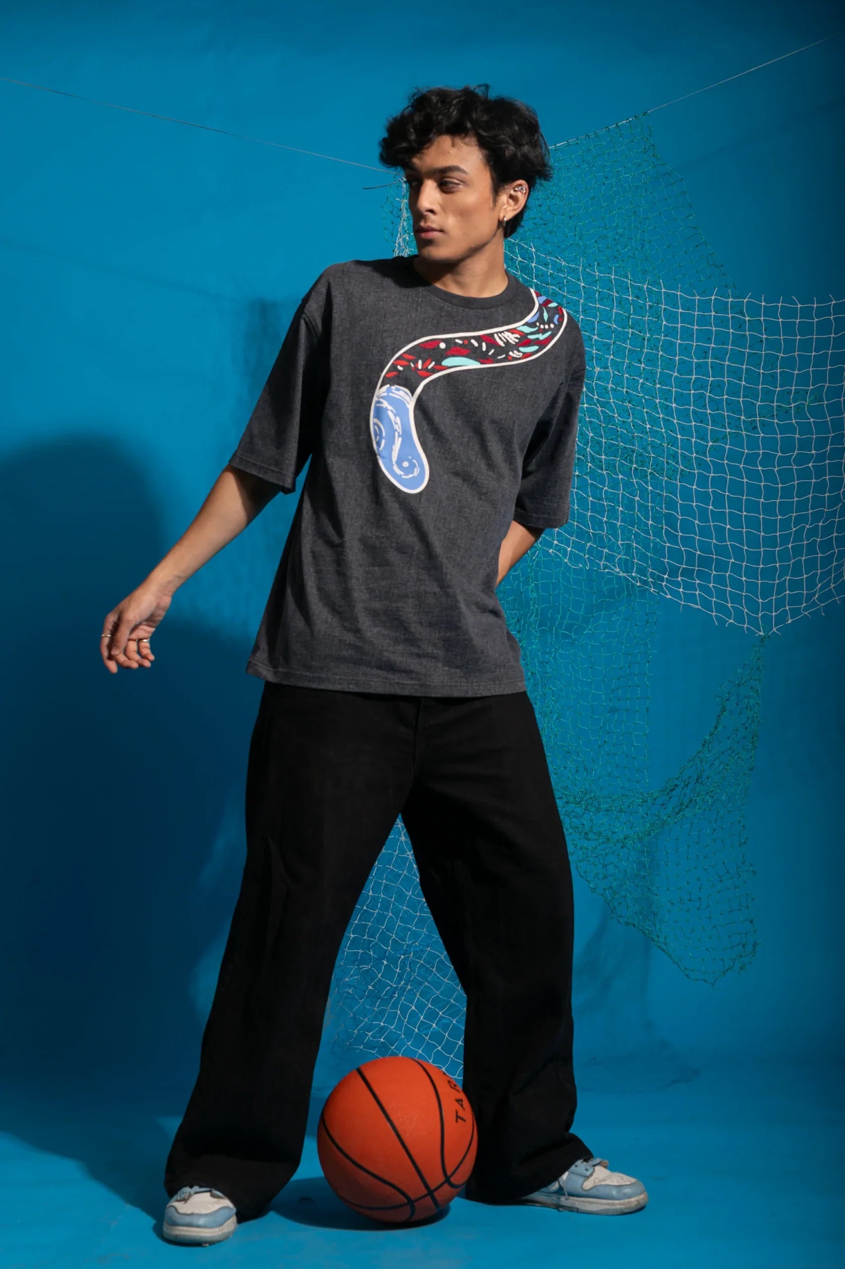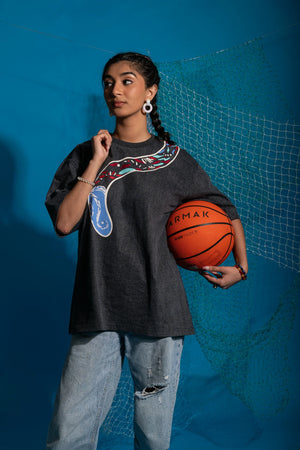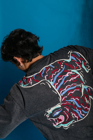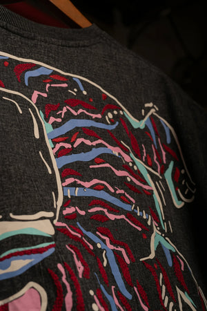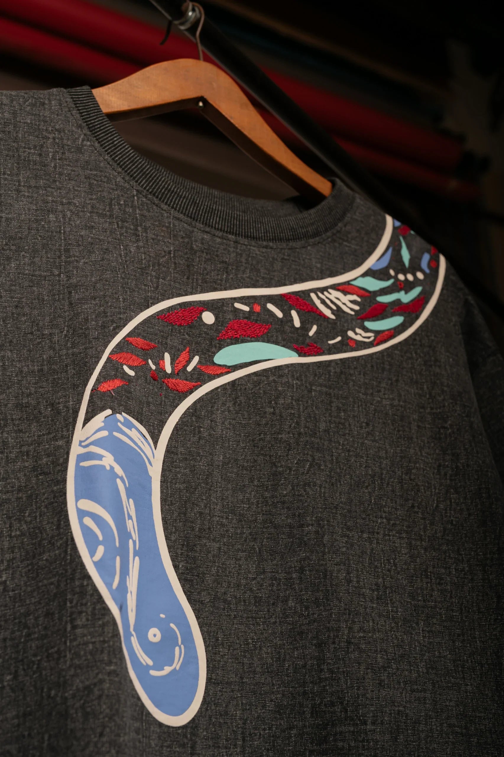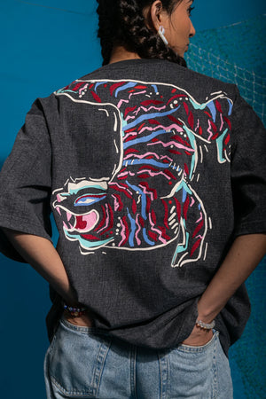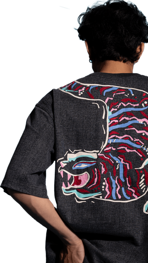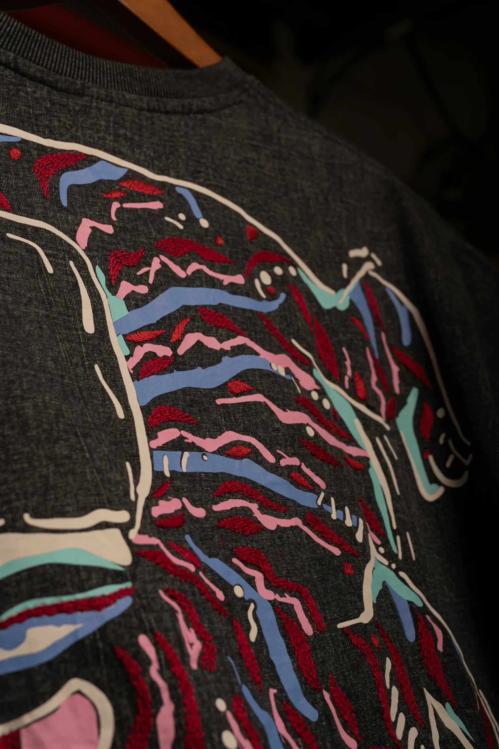 Kantha stitch embroidery from Bengal. Layers of screen and 3D print. Stone-wash texture. 100% pure cotton fabric.
