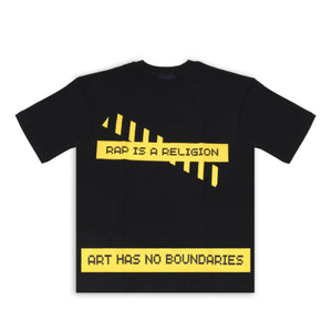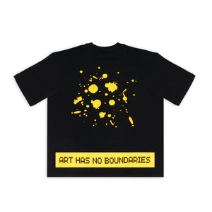 Black oversized tee, with caution design on the crest, and splash on the back in puff print.