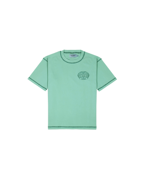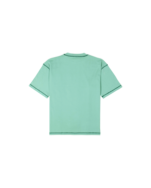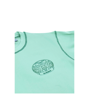 Reflections tee is crafted in mint green mid weight cotton with contrast forest green flat lock stitching & putti reflections graphic at the front. Relaxed fit