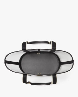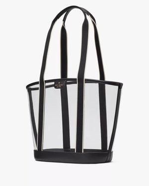 The KG083 is an imported unlined PVC tote with smooth PVC trim measuring 11.48"L x 12.0"H x 7.0"W, including a detachable pouch (11.4"L x 7.4"H), featuring an 11" handle drop, 11" strap drop, dog leash clip closure, and metal pin mount logo.