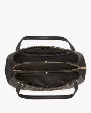 The KL033 is an imported straw and pebbled leather tote bag measuring 13.2"L x 11.12"H x 5.2"W with 2-way script logo lining, featuring a 12" handle drop, zip compartment, back zip pocket, triple compartment with snap closure, and metal pin mount with Spade logo.