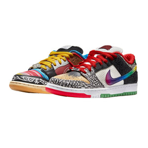 Ornate embroidery, wild designs, colourful gradients, and a range of quality fabrics mingle to turn familiar characteristics into something altogether new, with mismatched make-ups on each shoe highlighting some of the most distinctive components from P-hallmark Rod's collection. Mesh, leather, suede, patent leather, and woven fabrics make up the shoe's patterned upper of the Nike SB Dunk Low What The Paul. The design is completed by Paul Rodriguez's signature on the tongue and a unique edition metal deubrés.
