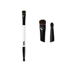 A dual-ended eyeshadow brush featuring both narrow and dense bristles, designed for applying, shading, and blending all shadow formulas.