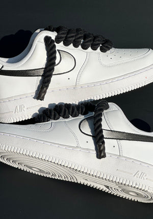The BLACK ROPE SWOOSH AF1 features a classic NIKE AF1 design in triple white, paired with fan-favorite thick black rope laces. The black ombre accents on the swoosh add a touch of boldness to this iconic sneaker.