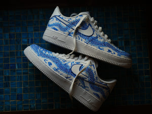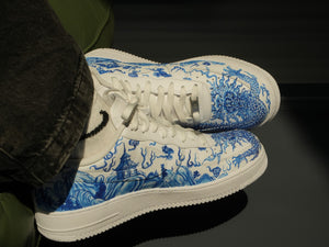 Introducing the BLUE DRAGON AF1. Inspired by Japanese and Chinese porcelain art, the blur porcelain dragon design adorns the outside while scenic details decorate the inside. Celebrate the year of the dragon with this exclusive piece of ART.