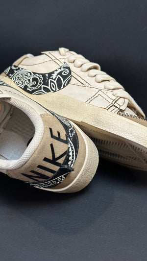 Introducing the Coffee Bandana Blazer low from Nike: a double-dyed premium leather blazer low, complete with a hand-painted bandana design on its iconic swoosh. Perfect for the fashion-forward individual who enjoys a subtle yet sophisticated touch of flair. Make a statement with timelessness and style.