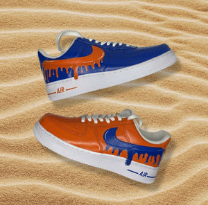 Hand painted orange and blue Nike Air Force 1 with inverted drip swoosh .