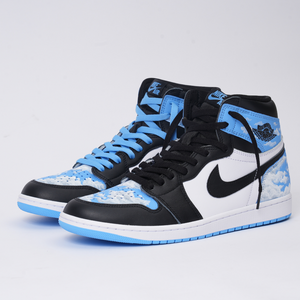 The iconic nike AJ1 RETRO high OG UNC toe meets in the clouds on the vibrant UNC blue sky, with a bold fly high badging on the back.
