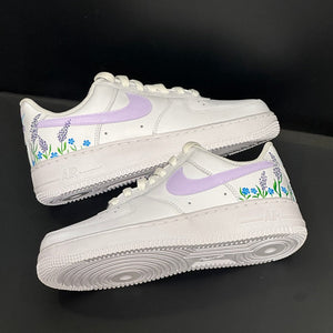 These premium Nike AF1s feature a hand-painted swoosh backdrop in delicate lilac, adorned with beautiful lavender flowers. Each step will feel like a stroll through a garden.