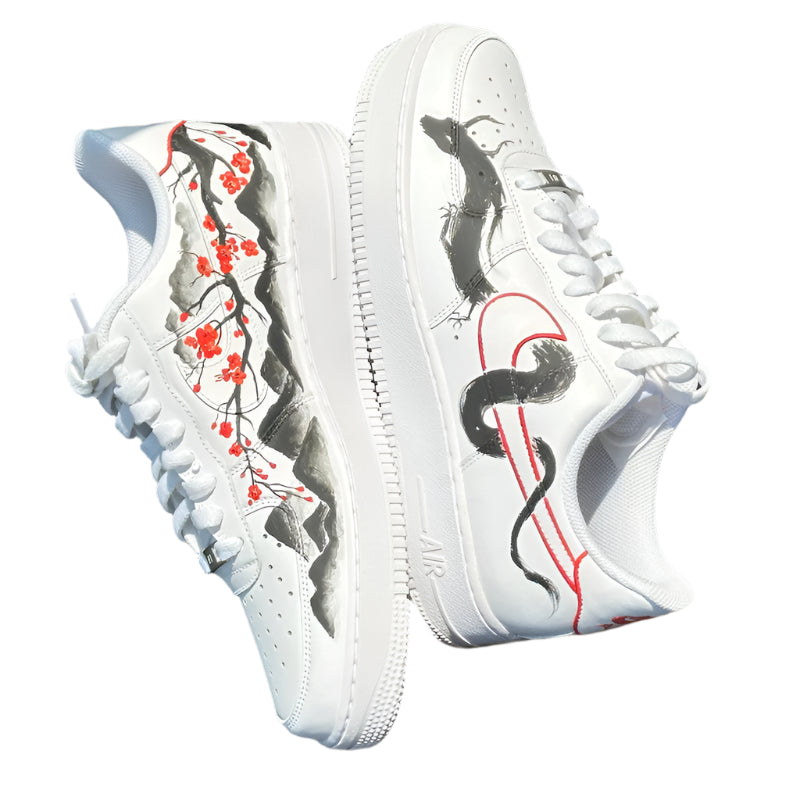These Nike AF1s feature hand painted Japanese art that showcases a magnificent black dragon flying over the iconic swoosh. The detailed cherry blossom tree and castles add a touch of elegance to these luxurious sneakers. Elevate your fashion game with the BLACK DRAGON AF1.