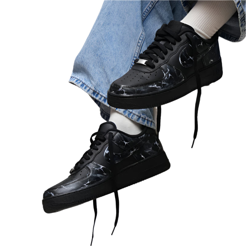 Our BLACK MARBLE AF1 is a fashion-forward statement piece that celebrates simple elegance. Refined black marble is intricately hand-painted onto a black Nike Air Force 1 silhouette, creating an exquisite aesthetic that's sure to turn heads. The perfect footwear for trendsetters and style mavens alike.